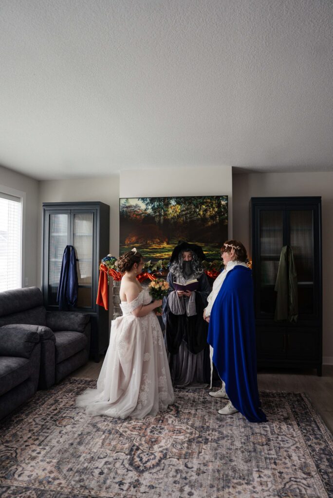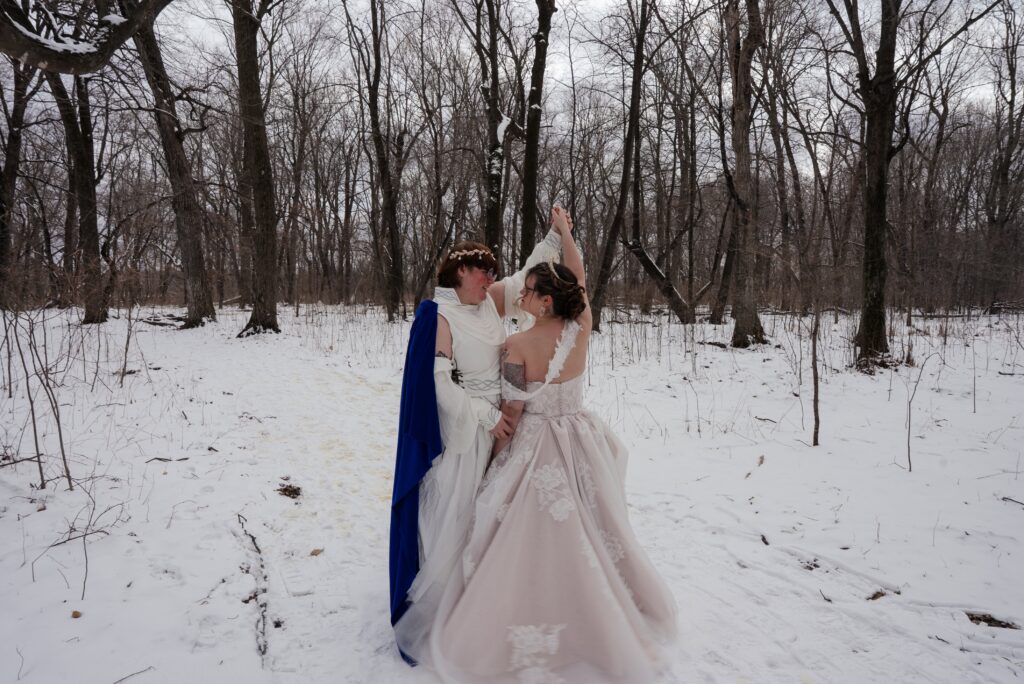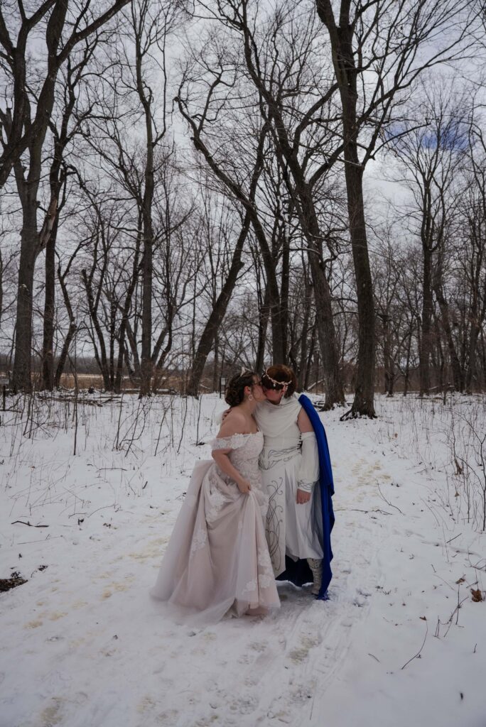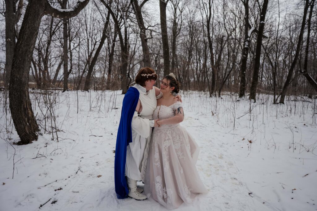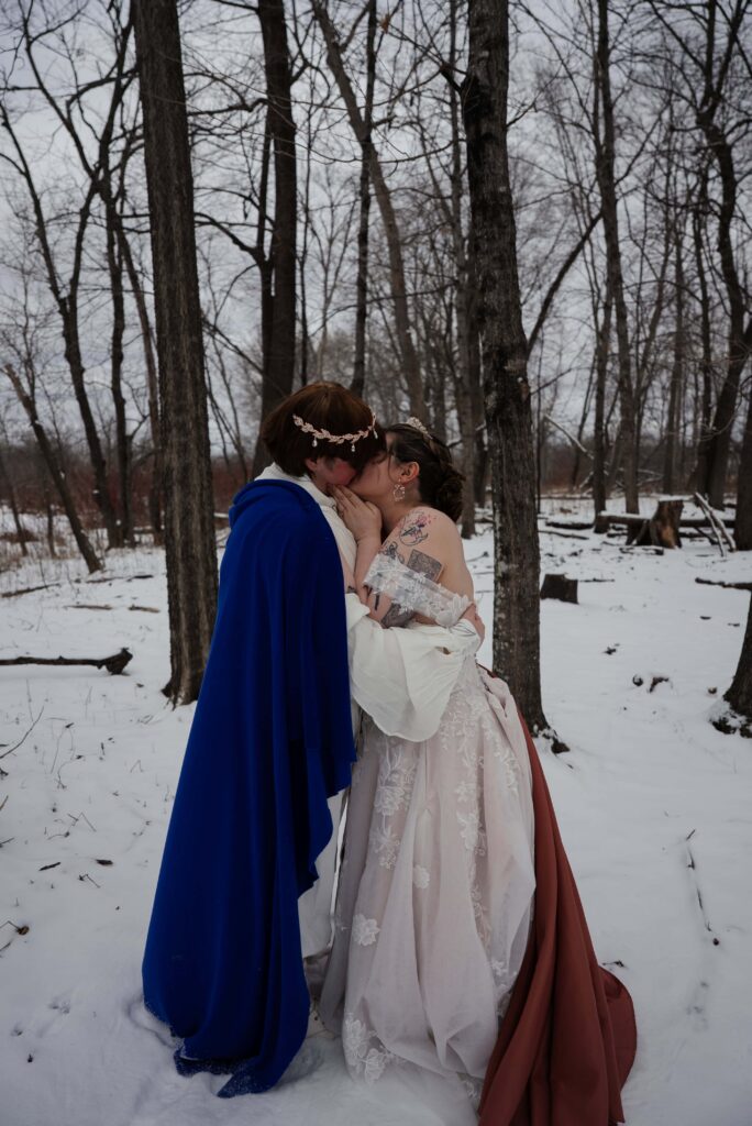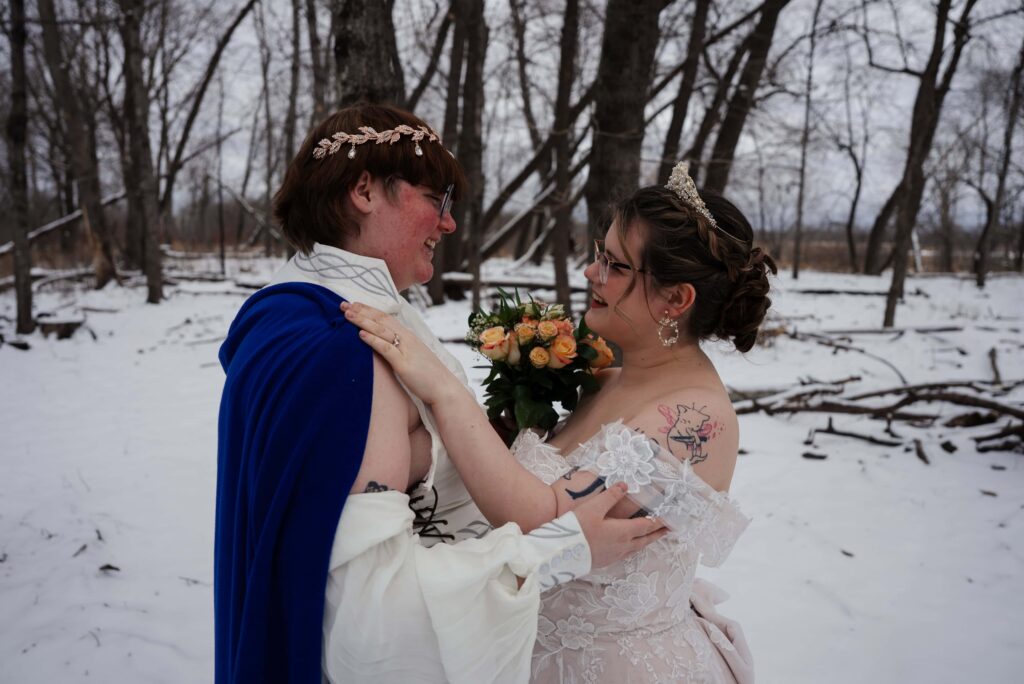Aubrey (she/they) and Charlie (they/them) held their queer micro-wedding at a family property in Blaine, Minnesota this winter. I immediately felt a connection with these two Capricorns on our consult call, but was even more excited to work together when they told me that the theme of their day was fantasy. It makes me so happy when couples center their day around the things they love, and as a massive LOTR fan, I was so excited to see everyone (guests included!) commit to delivering all the Ren-Faire vibes.